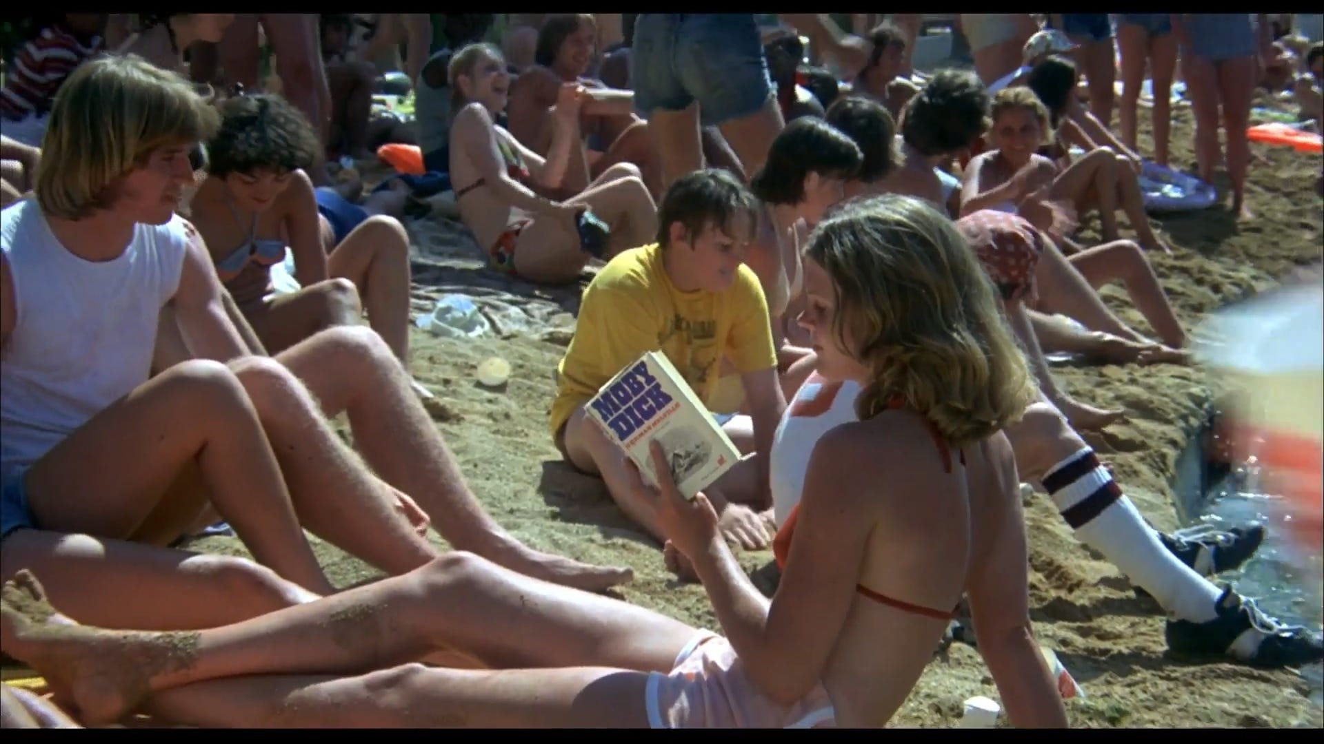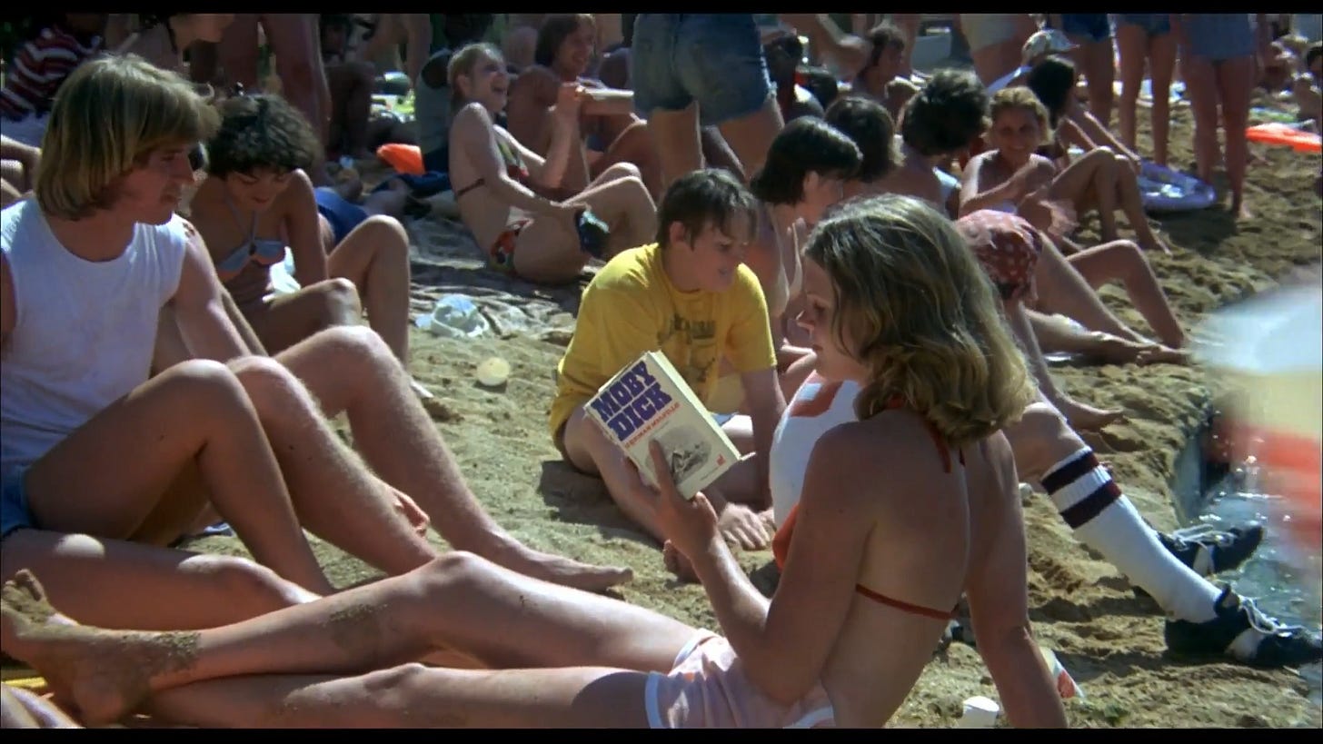 La retranca de poner a una chica leyendo, plácidamente en la playa, Moby Dick antes de que se desate el caos en Piraña (Joe Dante, 1978).